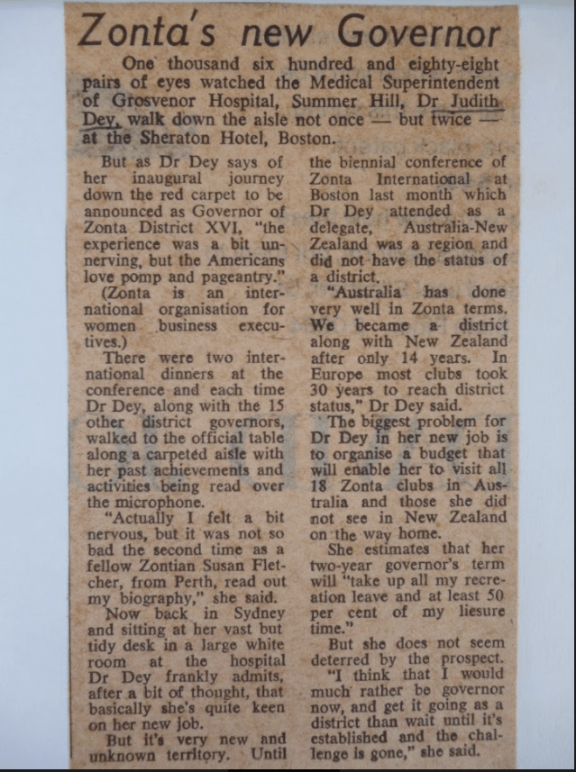 Despite her busy professional life, Dr Dey was also a Charter member of the Zonta Club of Sydney. She served as Club President from 1970-71 and was appointed the first District Governor of District 16 (Australian and New Zealand) in 1974.
