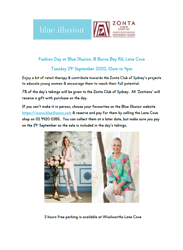 Events FundraisingEvent – Blue Illusion Fashion Day by zontaclubsydneySeptember 21, 2020 Leave a Comment on Event – Blue Illusion Fashion Day 2020-09-29T10:00:00 days hours minutes secondsuntilBlue Illusion Fashion Day Share this: Click to share on X (Opens in new window) X Click to share on Facebook (Opens in new window) Facebook Click to share on LinkedIn (Opens in new window) LinkedIn Click to email a link to a friend (Opens in new window) Email Like Loading...