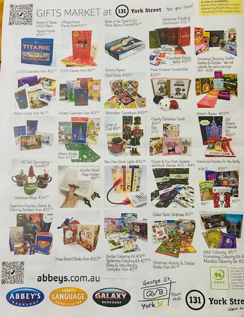You can see some of the pages from the Abbey’s catalogue below – they don’t only have books, but they have lots of gift ideas as well. They also have a comprehensive selection of books in languages other than English, and all sorts of useful texts. So get along to the shop on York St (opposite the QVB) or browse online and fill up your baskets with lots of goodies for Christmas.